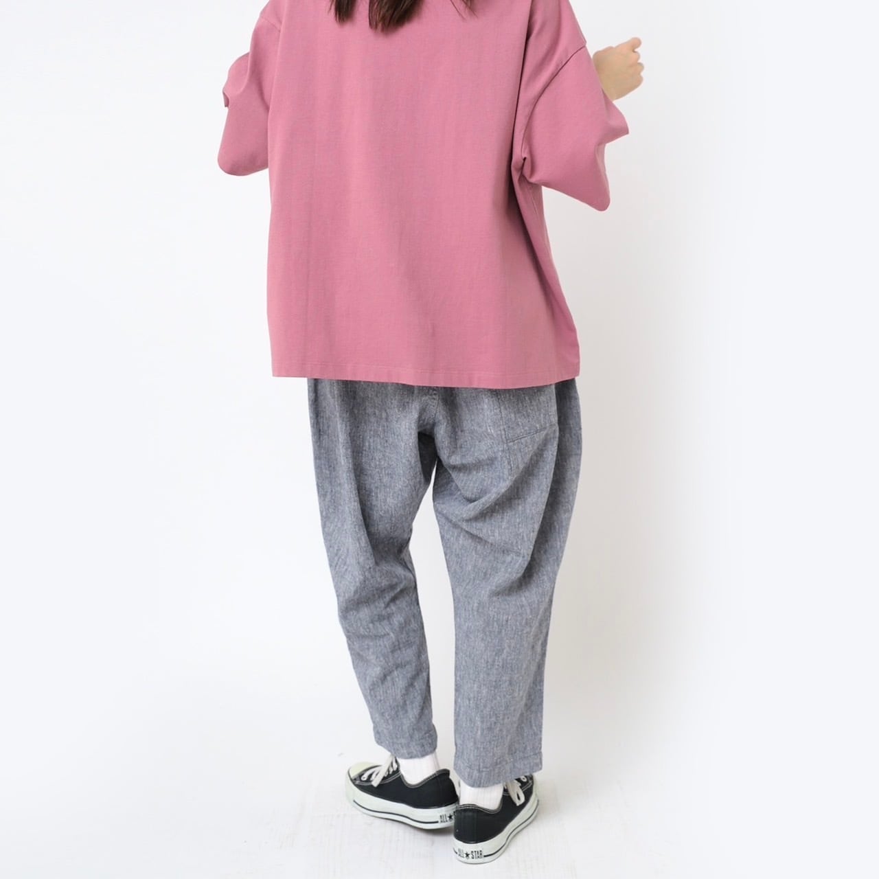 レングスは、少し短めのクロップド丈。腰~ヒップまわりをルーズなゆとり感でカバーするテーパードシルエットです。前後2本ずつのダーツがシルエットを丸く仕上げています。