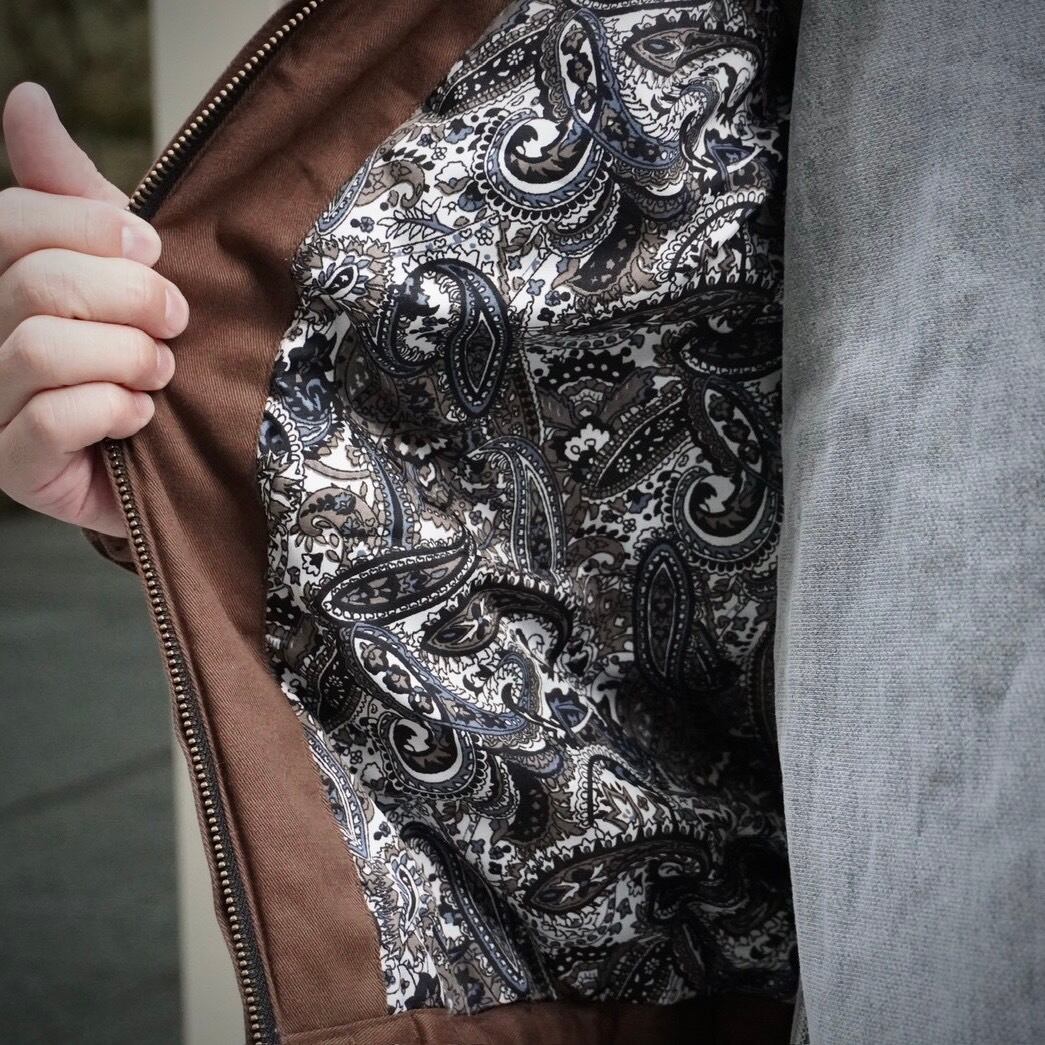 表面の起毛感、光沢感、さらにしっかりとしたコシのある生地感は当時のデッドストックかと感じさせるSugar&Co.のオリジナルファブリックです。その生地の良さを最大限に引き立たせるよう無駄のないシンプルなディテール。ほどよくゆとりを持たせたシルエットは、コーディネートの幅が広くデニムとの相性も抜群です。